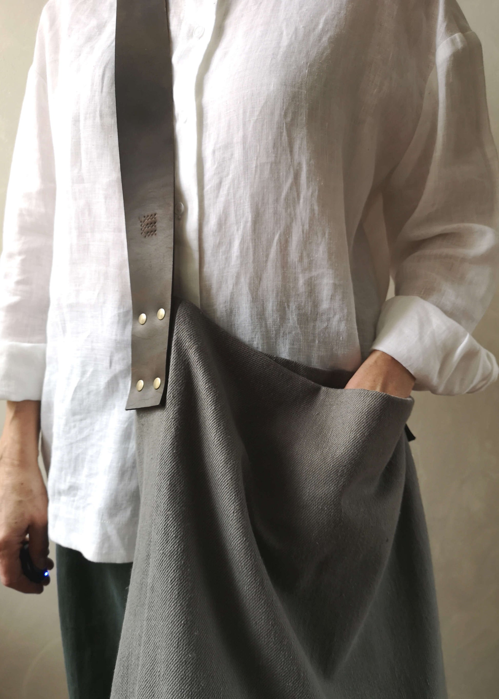 If ironing is required, use a hot iron suitable for linen (up to 200 °C). Iron the wool belt handle at a lower temperature suitable for wool. Iron while the fabric is slightly damp.